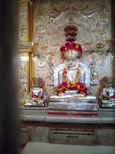 Architecturally, the temple is a magnificent structure showcasing intricate marble carvings, ornate pillars, and stunning craftsmanship that reflect the grandeur of traditional Jain temples. The temple's sanctum is adorned with an idol of Lord Adishwarji, made of white marble, symbolizing purity and spiritual tranquility. Surrounding the main idol are smaller idols of other Jain Tirthankaras, adding to the divine ambiance.