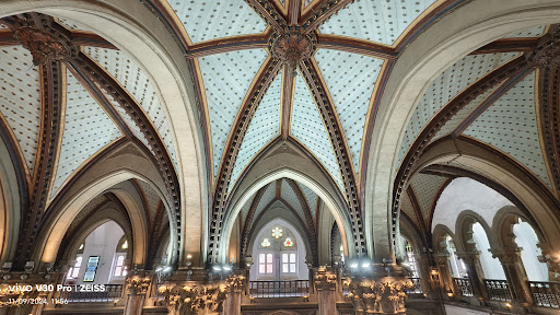 Stunning interior: stained glass, carved peacock motifs, cast‑iron staircases, and expert craftsmanship by Indian and British artisans .