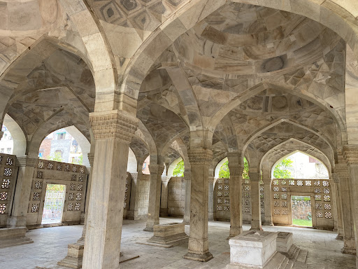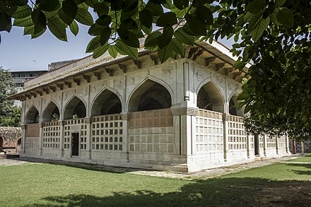 Read moreChausath Khamba monument was initially built as a hall in an innovative eclectic architectural style of the Mughal period. It was later converted into a tomb. It is a square structure constructed entirely of white marble. The structure (pictured with facades) has 64 columns that support twenty five bays. Each bay supports a dome. The domes are not visible externally since they are reverse domes (picture). The roof is flat. Each wall has five archesthat are held by square pilasters. In each face, between each of five pilasters, marble trellised screens have been fixed.2