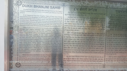 When this issue reached to Sri Guru Ram Dass Ji involved in the selfless service of the construction work of the Santokh-Sar he removing the good lady's doubl stated, "Eh Bibi, it is your selfless service, reliance and determination and the power of this holy place by the dint of which your crippled husband has grown healthy." The Guru himself named this holy place "Dukh...