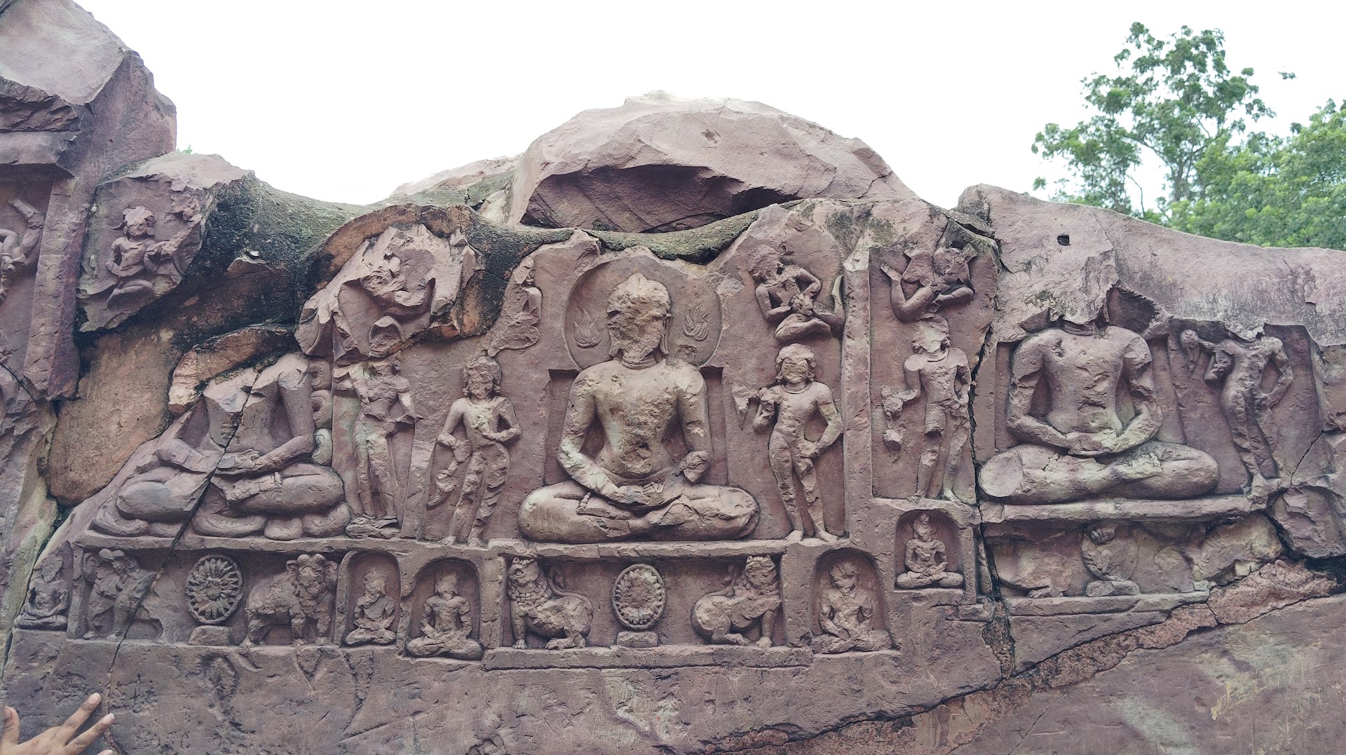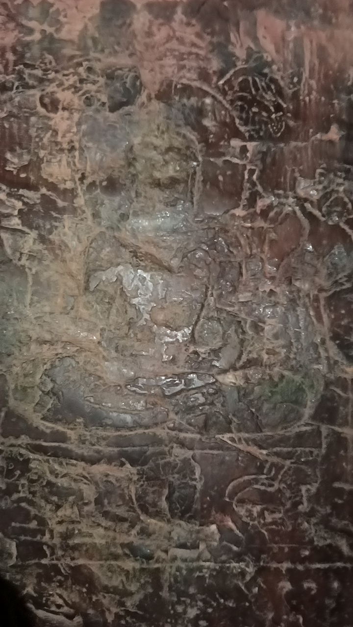 The smaller cave is located next to the main cave and is similar in structure. The cave is decorated with carvings of a Jain deity, possibly Mahavira.