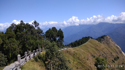 The walk begins with a paved pathway that goes downhill. The precarious yet is picturesque walkway built on top of a mountain that is covered with bottle green pines on one side and a lighter green carpet of grass, moss and little shrubs on the other. Reminiscent of bridges and pathways built in the mountainous regions of China, the walkway leads to the edge of a cliff offering sweeping views of the surrounding Himalayan ranges. You can also see the Darjeeling and Kalimpong hills which are at a lower elevation from here. It also offers gorgeous views of the confluence of two rivers, Teesta and Rangit, that meander through the...
