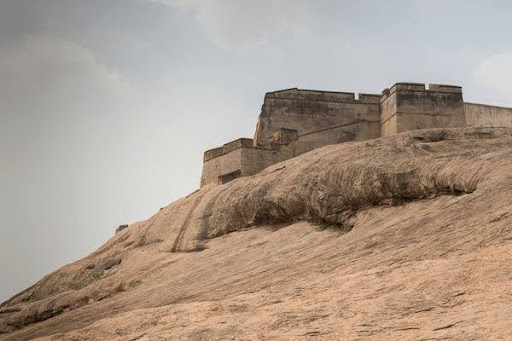 Dindigul located about 400 km from Chennai, is a strategic place located overlooking the valley through which the forces from Karnataka country gained access into the Madurai in late medieval period. The Nayakas of Madurai possibly erected the first fortification on the rock, a prominent elevated place overlooking the valley, in order to defend their country from the invading Mysore army. However, Haider Ali seems to have rebuilt the fort substantially as he used this as a launching pad to attack the British in this region during the Carnatic wars.