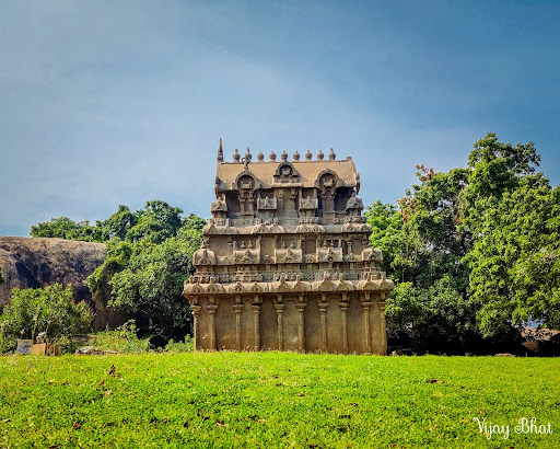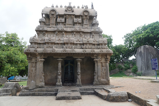 Read moreThis rock-cut temple in Mahabalipuram is a marvel of ancient craftsmanship. Carefully carved from a single block of pink granite, it stands fully completed—unlike several nearby unfinished chariots. The temple is a part of a group of stone "rathas" built by a South Indian dynasty, carved during the late seventh century by kings like Mahendravarman I and Narasimhavarman I .
