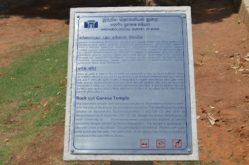 Ganesha Ratha is a temple or Chariot (Mahabalipuram). It is one of ten rathas carved out of pink granite within the group of these monuments. This RATHA is an example of monolith Indian rock-cut architecture of 7th century, during the reign of King Mahendravarman I and his son Narasimhavarman I. Initially constructed as a Shiva Linga (Lord Shiva) Temple, is now with a Ganesha deity.