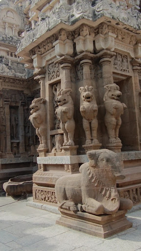 An eighth-century Shaivite temple constructed with the patronage of the Pallava King Narisimhavarman II, also known as Rajasimha, the Kailasanathar temple is the oldest known temple in Kanchipuram, Tamil Nadu. The temple was built along the banks of the Vegavathi river between 700 and 728 CE, and is a prime example of Dravida temple architecture. Among the earliest structural sandstone temples in South India built on a large scale, the Kailasanathar temple establishes two characteristic features that were later shared by most structural Pallava temples: pillars and pilasters with a stylised lion or horned-lion base (simhapada or vyalapada) and a plinth of granite to prevent seepage and stabilise the superstructure. Although the architectural style and general plan were a legacy of the early Pallava period rock-cut temples, the medium of sandstone rendered these later temples more suitable for sculptural ornamentation. Although the temple was originally named after its patron — Rajasimha Pallaveshvara — the later and now-popular moniker of Kailasanathar was derived from an inscription that described its lofty vimana as touching the realm of Shiva (Kailasa).