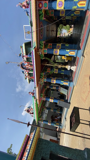 The temple has traditional Tamil temple architecture with colourful gopuram studded with stuccos featuring mythological figures. There is a flag post with interesting carvings at its base.