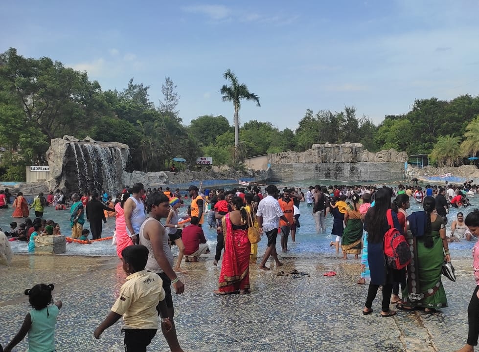 a. Food price was kind of OK and nominal, we ordered egg rice and the quantity was soo much.. I would prefer buy 1 and share it with two to avoid wastage π b. Chicken 65 was good, piece was a bit small, the onions they provided with them were smelly and had wiered taste c. All water, juices were on MRP d. Milkshakes, popcorn, cotton candy can be found near short movie theater Evening snacks (cutlet, samosa, paneer roll, corn etc are available near the wave pool spot) price was ok and the taste was good.. I was not happy with the wave pool seeing soo many people. So i didn't hop in a. My frnds said the falls was really good, fresh with cold water and was very much like real falls b. The wave pool water was warm and they didn't feel good with the wave pool Seperate place for both men and woman to enjoy the pool and falls Evening dance events are held at the start of the park Enough parking area.