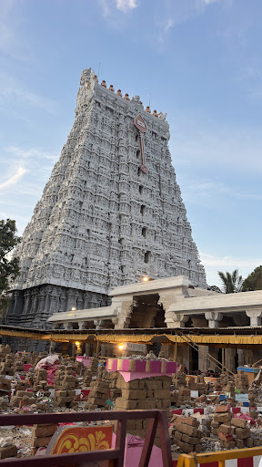 The western Rajagopuram (main tower) rises to 133–137 ft, has nine tiers (kalasams), and unusually faces west instead of east—likely due to proximity to the sea
