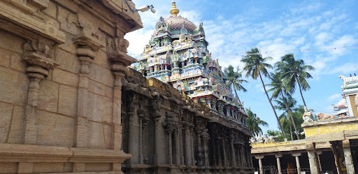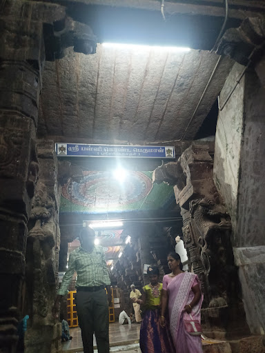 In this temple, Kaalamegha Perumal is giving dharshan with his usual pose, lower right hand with abhaya mudra, upper right hand with divine discus (sudharshana chakra) and lower left hand is holding the mace (gaumodaki), upper left hand holding the conch (panchajanya). His Prathanasayana appearance is unique here and can never be seen in other Divya Desams. Goddesses Sridevi and Bhudevi also give dharshan beside him on the left and right side of the Perumal respectively. One of the notable features of this temple is that the Goddesses don't touch the level of the feet of the presiding deity. Goddess Lakshmi is worshipped here as Mohanavalli Thaayar, the consort of the main deity is housed in a separate shrine. The procession idol of the Thaayar is never taken off from her shrine except for the occasion of Panguni Thirukalyanam. This temple is also famous for 16-handed Chakrathaazhwar, holding 16 different equipments. He is surrounded by 48 apsaras (female spirits). Yoga Narasimhar is seen at the backside of Chakrathaazhwar. It also has shrines for Andal, Pallikonda Ranganathar, Anjaneyar. In the pillared hall, we can find the sculptures of Rathi and Manmathan.