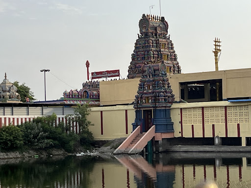 A 4-pillared mandapam and a 5-tier Rajagopuram are on the south side. The outer praharam (circumambulatory path) has shrines for Vijaya Ganapathi, Urchava Murthis, Shanmugar, Sri Devi Karumari Thiripura Sundari Amman, Idumban, Veerabhagu, and a peacock enclosure.