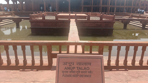 Read moreAnoop Talab situated in the front of Khawabgah complex in Fatehpur Sikri. This square tank, made of red sand stone, has a beautiful platform enclosed balustrade ornate with 'jaalis', in its center. The raised seat in the middle of this platform presents the most romantic loveseat ever conceived inside a building. This platform is connected to the sides of the tank through four causeways. The tank was connected to the water work system to the north of the city to ensure the inflow of fresh water into it. It was linked to the Sukh Tal, outside the walls of the fort, to avoid overflowing of water. Scribes to Akbar's court have recorded that this pool was filled with gold, copper and silver coins. In his memoirs, Jehangir has mentioned that he distributed copper and silver coins worth one crore three lakh rupees, that were emptied out of the tank,...