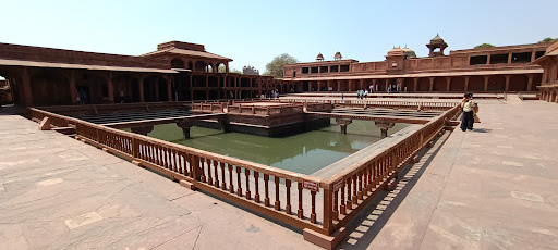 Read moreAnoop Talab, also known as Anoop Talao, is a beautiful ornamental pool located in Fatehpur Sikri. The entrance is within the Panch mahal. It was built during the Mughal era by Emperor Akbar and served as a venue for musical performances and royal gatherings. The pool is surrounded by red sandstone architecture and features a square platform in the center, connected by walkways. This platform was famously used by legendary musicians like Tansen to perform for the emperor.