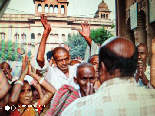 The Jaipur Temple, opened in 1917 after thirty years of work and one of Vrindavan’s most opulent and grandiose old temples, has met a peculiar fate, having been cursed at the time of its inauguration. It was built by Sawai Madho Singh II, the Maharaja of Jaipur, of finely carved sandstone and enshrines Radha Madhav, Hans Bhagwan and Anand Vihari (all forms of Krishna). To facilitate the movement of the huge stones required, the maharaja financed a rail line connecting Mathura to Vrindavan. The pujas are done according to the Nimbarka Sampradaya. Today it is managed by the government of Rajasthan, while it appears to us that many of the other temples here are owned and managed by the priests. The temple is nearly deserted during our evening visit, a time when other temples are packed. The chief priest, Roop Narayan Sharma, explains that when the temple was inaugurated, local priests were not engaged. Instead, priests were brought in from Kashi (Varanasi) for the ceremonies. Upset at being ignored, and envious of the rich rewards showered on the Kashi priests, the local priests cursed the temple to never be wealthy. Sharma said that even though newly built temples are attracting many devotees, “this temple gets neither devotees...