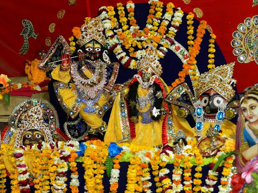 The Bharatpur state king found a beautiful deity of Sri Radharani among his treasure in 1580. He brought this idol to the sacred kutir of Sri Shyamananda prabhu and here he performed her marriage with Sri Shyam Sundar on the day of Vasant Panchmi. The king built a beautiful temple for the couple and then Sri Lala Lali were shifted from underground grove of Shyamananda Prabhu to this temple The Radha Shyamsundar temple has three sets of idols: