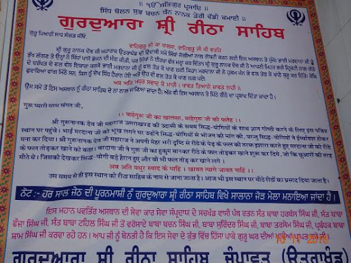 Gurudwara Shri Reetha Sahib is sitauted in the Reetha Sahib Village Distt Champawat, UttaraKhand. It is 209 km from Gurudwara Shri Nanakmata Sahib. Shri Guru NanakDev Ji , had visited this place. He held much spiritual discussion with the Gorakhpanthi Jogis, who lived here. When Bhai Mardana ji asked Guru Sahib for food, Guru Sahib asked Bhai Sahib to Ask the yogis. Yogis denied and asked Bhai Sahib to ask your Guru if he is such a Spritual Man. Then Guru Nanak Dev Ji asked Bhai Mardana ji to eat Reetha, a fruit on the tree which nor mally not sweet to eat but When Bhai Mardana ji plucked Reetha Fruit and he found it was Sweet. The reetha's were sweet on the side which Guru Sahib was sitting, and sour on the side on which Yogis were sitting. The yogis got angry and set a snake on tree with there powers. When Guru Nanak Dev Ji looked on the Snake it got frozen. Even today is Reetha fruit Sweeta to eat and distributed in Prasad. Tree still stands in the Premisis of the Gurudwara Sahib.