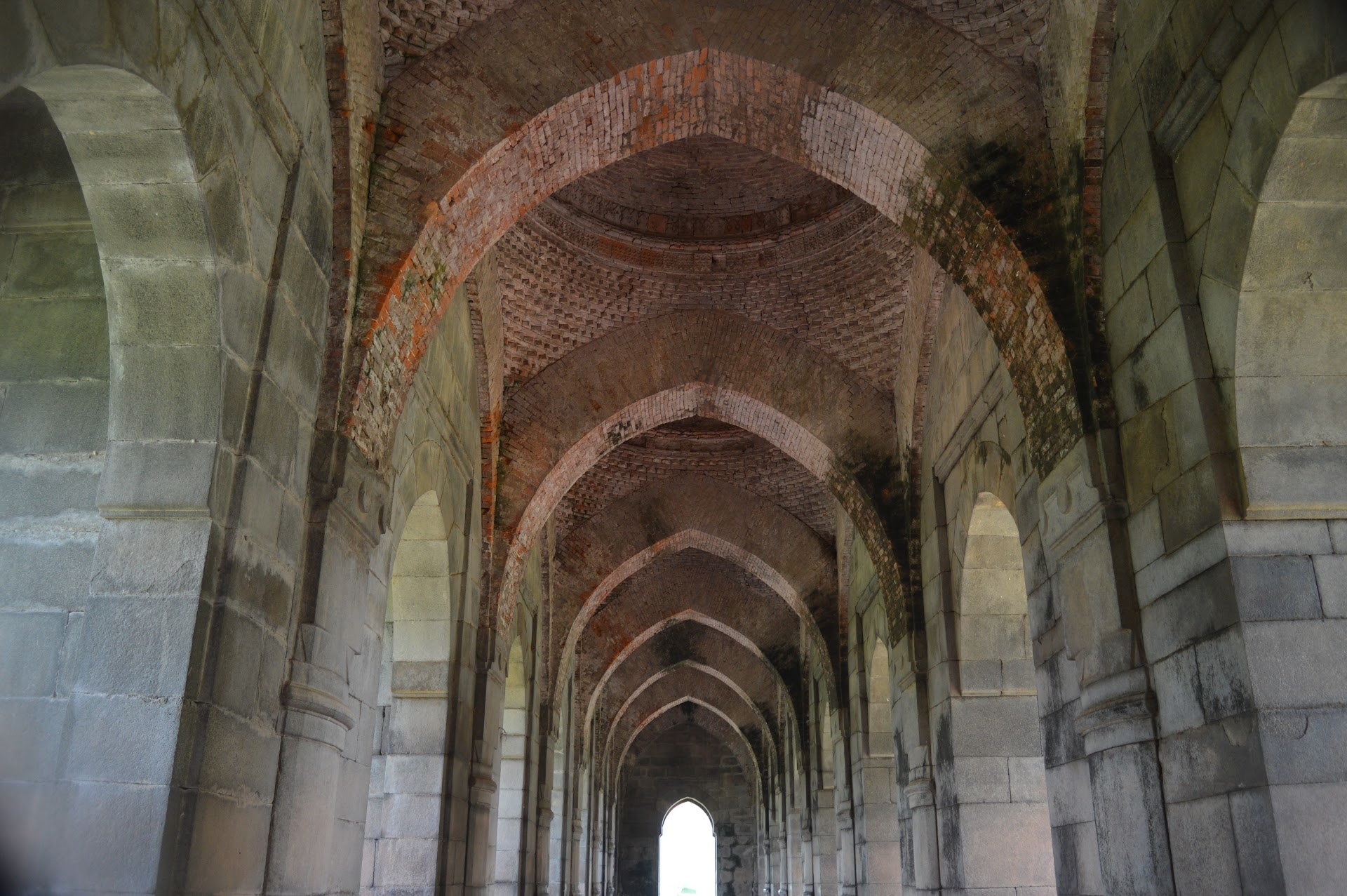 The eleven arched entrances of the east façade open into a long domed verandah formed by wide piers on the east and west sides. The verandah in turn, opens onto a prayer chamber composed of three aisles with eleven bays each.