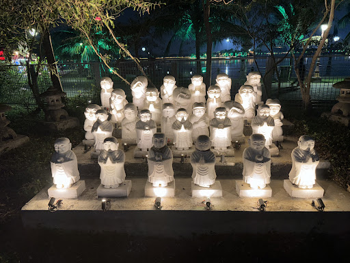Small buddha sculpture alcove: Small smiling Buddha sculptures welcome visitors near the entrance. These are dramatically illuminated for nighttime effects.
