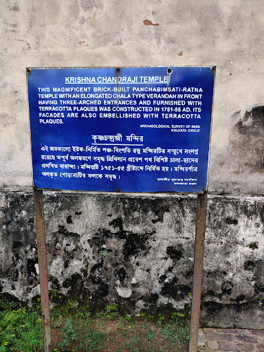 Read moreThe very beautiful terracotta tample Krishna Chandraji Temple is one of the temples inside the Rajbari Complex in the town of Kalna alias Ambika Kalna. The town is in Burdwan district of West Bengal. Built in 1751, Krishna Chandraji Temple is a unique temple as it has 25 pinnacles. Only three other terracotta temples of Bengal has 25 Pinnacles. It has a small Ekchala styled small Mandap (popularly known as Jagamohan) with a triple entrance in its frontal side. Here the pinnacles are distributed in 12+8+4+1 style. Built by Raja Trilokchand in the name of his mother Lakshmikumari Devi, the temple has exquisite terracotta works on its wall and even on the Natmandir. In the terracotta plaques, Krishna & Balaram leaving for Dwaraka, Foreign Pirate Ships, scenes from social life, Horseback Soldiers, Zamindar on an elephant, Queen on a palanquin and Vaishnavas dancing with musical instruments are worth noticing. The main deity of this temple is Krishnachandra and Radha.A excellent example of terracotta temple. But time spotted on wall. Three sides walls terracotta plates are fully vanished. Only front facing wall are left from ruins. Some plates are really damage by salty weather or human. Please stop plaster of paris mould. It's destroyed terracotta plates. Don't touch by hand, don't colouring. Must visit this place for half an...