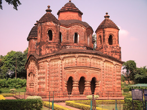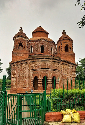 It stands on a low square plinth and consists of an ambulatory pathway with a porch opened by three arches on the four sides of the temple. This brick-built temple consists of a square roof surmounted by five towers. The central tower itself is octagonal while the other four are square in shape. The walls are richly decorated with terracotta carvings featuring aspects of Lord Krishna's life. The curved ceiling of the temple is influenced by Islamic architecture which cannot be seen in any other temple.