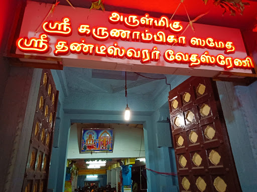 The presiding deity is Dandeeswarar, in Shiva Lingam form in an east-facing sanctum. It was said that during the early period, the rays of the sun would fall on the Lingam on the exact date of the Tamil New Year day, but later with high-rise buildings built around the temple, this could not be viewed.