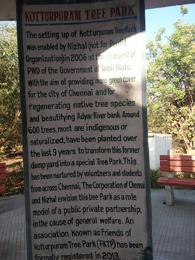 Read moreKottupuram Tree Park is an excellent place to visit for all ages. With over 600 hundred trees from 100 different species, you can see many varieties which you might have only heard about. The space is maintained by Nizhal an NGO which has been working tirelessly for more than a decade to keep this place in shape. It is easy to see the passion and love of nature from the clean and well maintained look of the park.