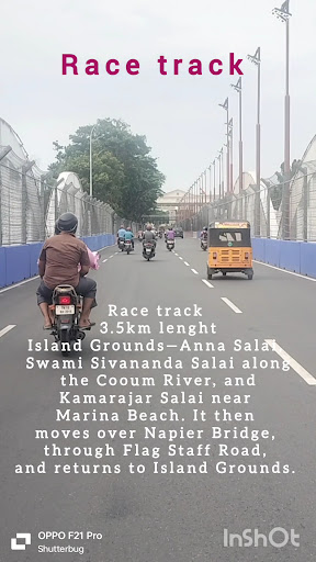 recently part of a major motorsport event The Chennai Formula Racing Circuit, a 3.5km street circuit, hosted the Indian Racing League and F4 Indian Championship on August 31 to September 1, 2024 ¹. The circuit features 19 corners, stretching from Island Grounds to the Napier Bridge, and offers stunning views of Marina Beach Road and the Bay of Bengal ⁴. The event marked a significant milestone in Indian motorsports, being the first night street race in the country.