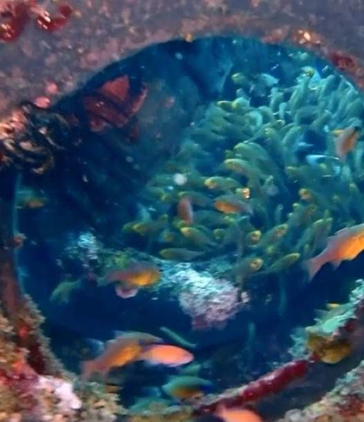If you can dive 3-10 meters, this spot is really cool because you can go down and look inside the rooms and go hang with the...