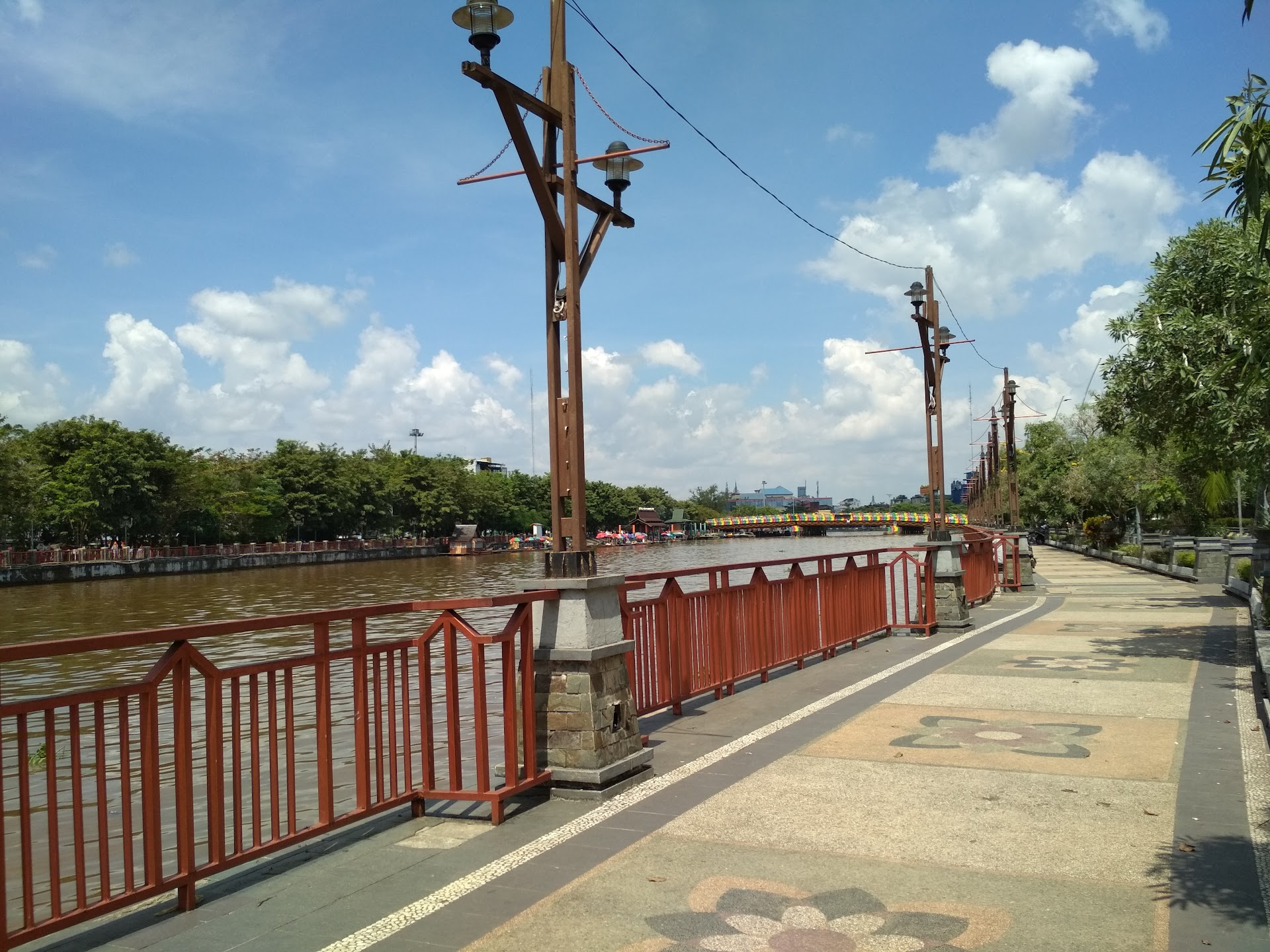 Fasilitas area jogging track/ pedestrian dipadu dengan taman di area bawahnya sudah cukup bagus, ditambah dengan sculpture 0 km di area entrance, walaupun maaf desainnya jelek 😅 kenapa jelek? Karena desain hanya dibuat untuk area depan saja, sedangkan pandangan orang dari sungai melihatnya hanya sebatas kerangka saja, yang mana harusnya Banjarmasin yang memiliki banyak sungai bisa memanfaatkan hal tersebut menjadi poin utama wisatawan datang agar bisa menikmati pemandangan menjadi lebih indah dan ngeblend antara sungai dengan daratan. Kesan yang didapat dari desain taman ini hanyalah pembeda antara darat dan sungai, sekali lagi sangat disayangkan.