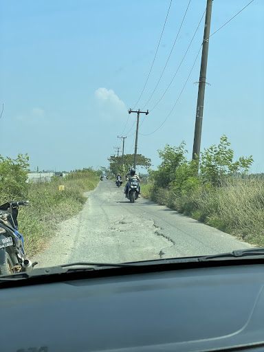 As you can see in my photo, the road to get there is only a single (and half?) lane way, and in very bad condition ☹️ along the left and right sides of the road there are ponds with dirty water and mounds of building material scraps so we always have to be very careful when we pass cars from the opposite direction
