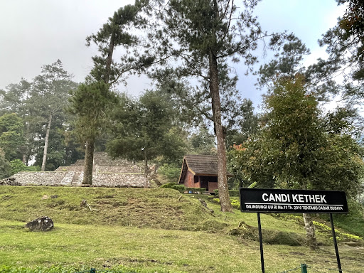 Sejuk, sepi dan mistis. Candi Kethek merupakan candi hindu wisnu yang mirip dengan candi sukuh, berbentuk piramid namun hanya terlihat satu sisi dari depan. Jadi mirip piramid suku Aztec. Saat ini masih aktif digunakan untuk ibadah namun sepi buanget. Mungkin karena letaknya yang berada di 1500 mdpl. Jadi kalau ke Candi Cetho banyak yang tidak tahu keberadaannya, kecuali para pendaki Gunung Lawu. Karena candi ini berada di jalur pendakian dan di atas Gunung Lawu, berjalan kaki sekitar 20-30 menit dari samping pintu masu Candi Cetho. tepatnya di Dusun Cetho, Desa Gumeng Kab Karanganyar. Dibangun pada abad 15 namun kalau melihat bentuknya seperti pada masa megalitikum. Diduga digunakan untuk ibadah pembebasan kutukan/ruwatan. Disebut kethek karena dahulu banyak terdapat kethek=kera di sekitarnya dan lebat rumput liar sehingga disangka istana kera. Tahun 1999 terjadi kebakaran hutan dan membuat para kera (tidak termasuk dia 😬) pindah habitat. Ada pula yang menyebut kethek karena dilihat dari bawah mirip sosok Hanoman tokoh epos hindu. Meskipun 1842 pernah ditemukan namun baru dibuka dan ditemukan kembali oleh warga pada 1999 pasca kebaran. Baru ya?! Di area ini banyak kabut dan mistis, selain pemujaan ada sumur tertutup, di bawah depan ada bangunan penjaga hutan dan untuk menuju kesini Anda akan melewati aliran sungai kecil yang licin. HTM cuma 7000 dari kawasan puri taman saraswati....