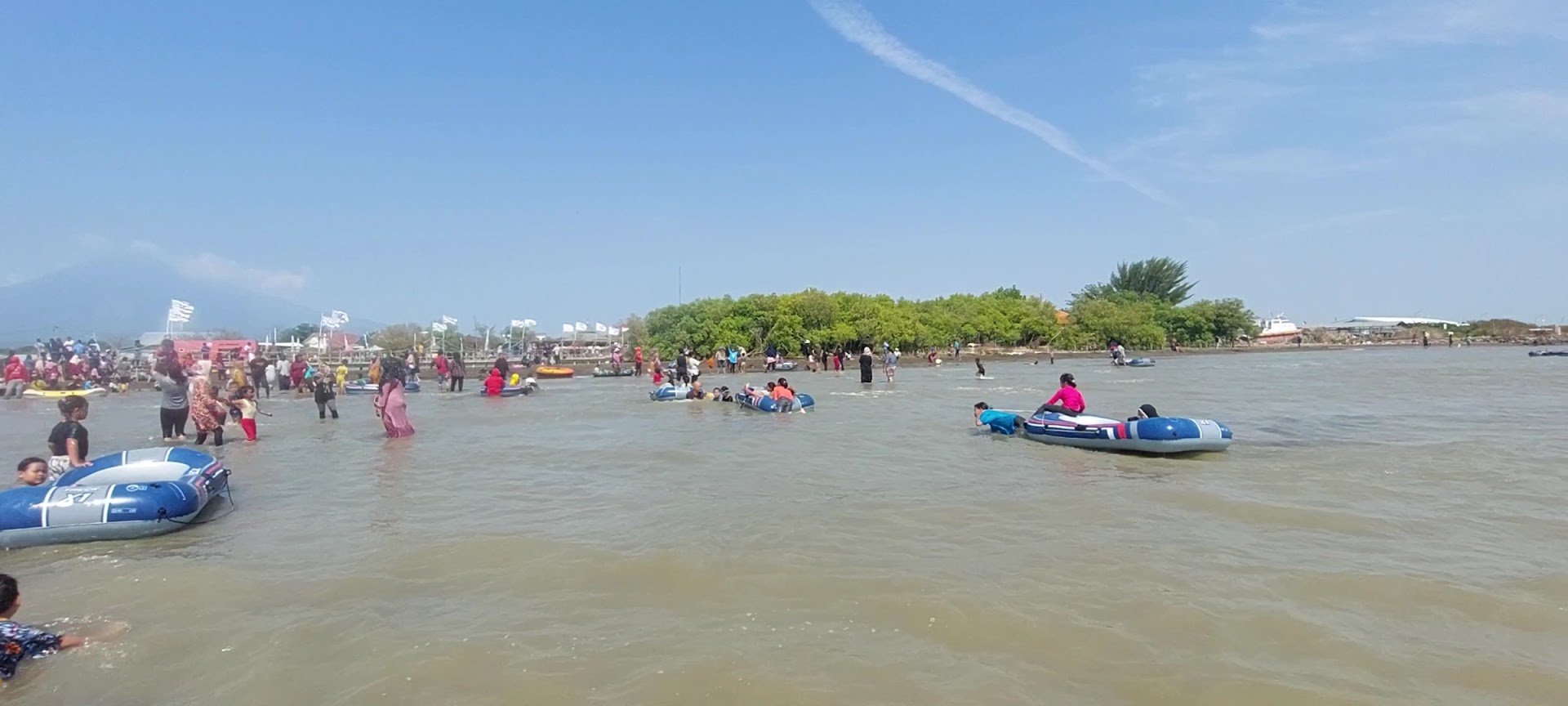The beach is located next to harbor and fishermen's village, you can imagine how it smells. You can't see the beach, because it is covered by warungs and trash. No shady trees to sit under, and if you want to build sandcastels you can go to small sandy-island few meters from the beach, in the middle of the sea. You can hire dingy-boat or walk through the brown water. Blackish brown, not blue. And if you want to clean up after, you must buy a bucket of water for Rp2000. No shower...
