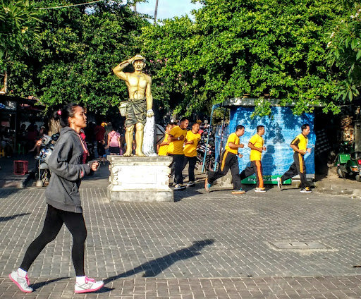 The beach on the right side, in front of some restaurants and shops that sell the usual stuff(Tshirts and sarongs), is a lively place in the afternoon with locals and local tourists taking a dip in the sea with sellers of tahu goreng with peanutsauce, Pantai Segara Ayu is easily reachable for locals by scooter or car and has a lot of parking space. On the left side of the statue while facing the sea are 3 nice warungs on the beach, open from early morning until the evening: Warung Citra, selling tipat cantok, the Balinese gadogado, rudjak (fruitsalad), a Teh cup Poci (cold drinks) warung that also does a good soto babi for Rp 15.000 and, the last one, Warung Komang selling nasi campur for Rp 10.000. These warungs share tables unther the tree so you can order from each warung. They also sell tea, coffee, drinks and snacks. The part of the beach on the left side of the statue is taken up by boats, while there is a lot of seaweed plus dirt. Swimming is done on the right side of the statue in front of the restaurants or on the left side further on in the direction of Inna Bali...