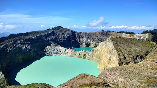 Kelimutu (pronounced [kÉliËmutu]) is a volcano, close to the small town of Moni in central Flores island in Indonesia. The volcano is around 50 km to the east of Ende, Indonesia, the capital of Ende regency in East Nusa Tenggara province. The mountain has three volcanic crater lakes that differ in color. The science of the Kelimutu lakes is relatively well-known.[2] Lake colors periodically change due to adjustments in the oxidation-reduction status of the fluid of each lake, and also considering the abundance of different major elements, such as iron and manganese. Oxidation-reduction status depends on the balance of volcanic gas input and rainfall rate,[3] and is thought to be mediated by the groundwater system in the volcano itself[4]. The colors in the lakes change independently from each other, as each has its own unique connectivity to the underlying volcano's activity. Between January and November 2016, the colors of the craters changed six times.[5] Although it is widely believed that the changes are unpredictable, it is more accurate to say that the lack of any regular monitoring of the volcanic system precludes scientists from having the data necessary to drive widely available predictive...