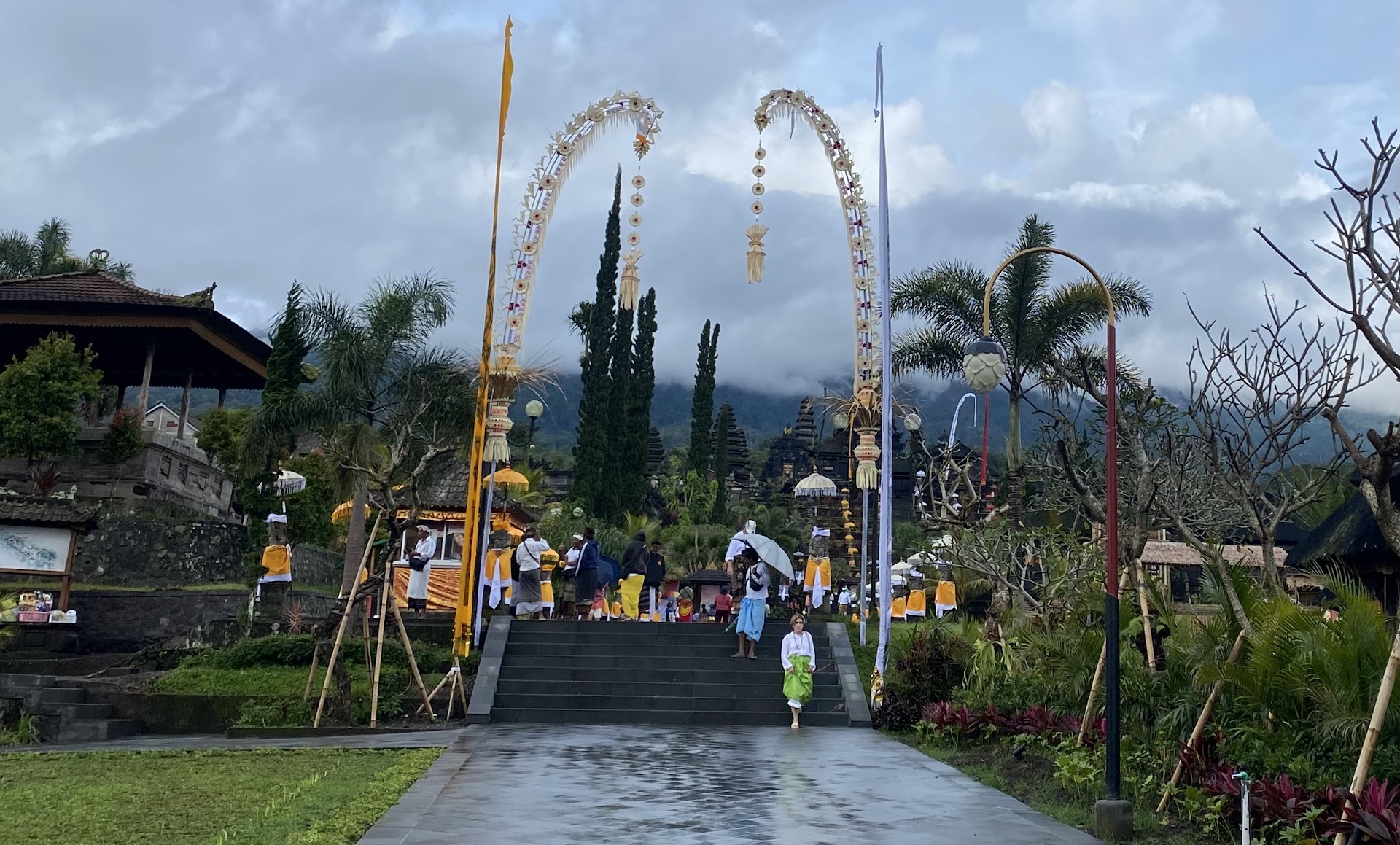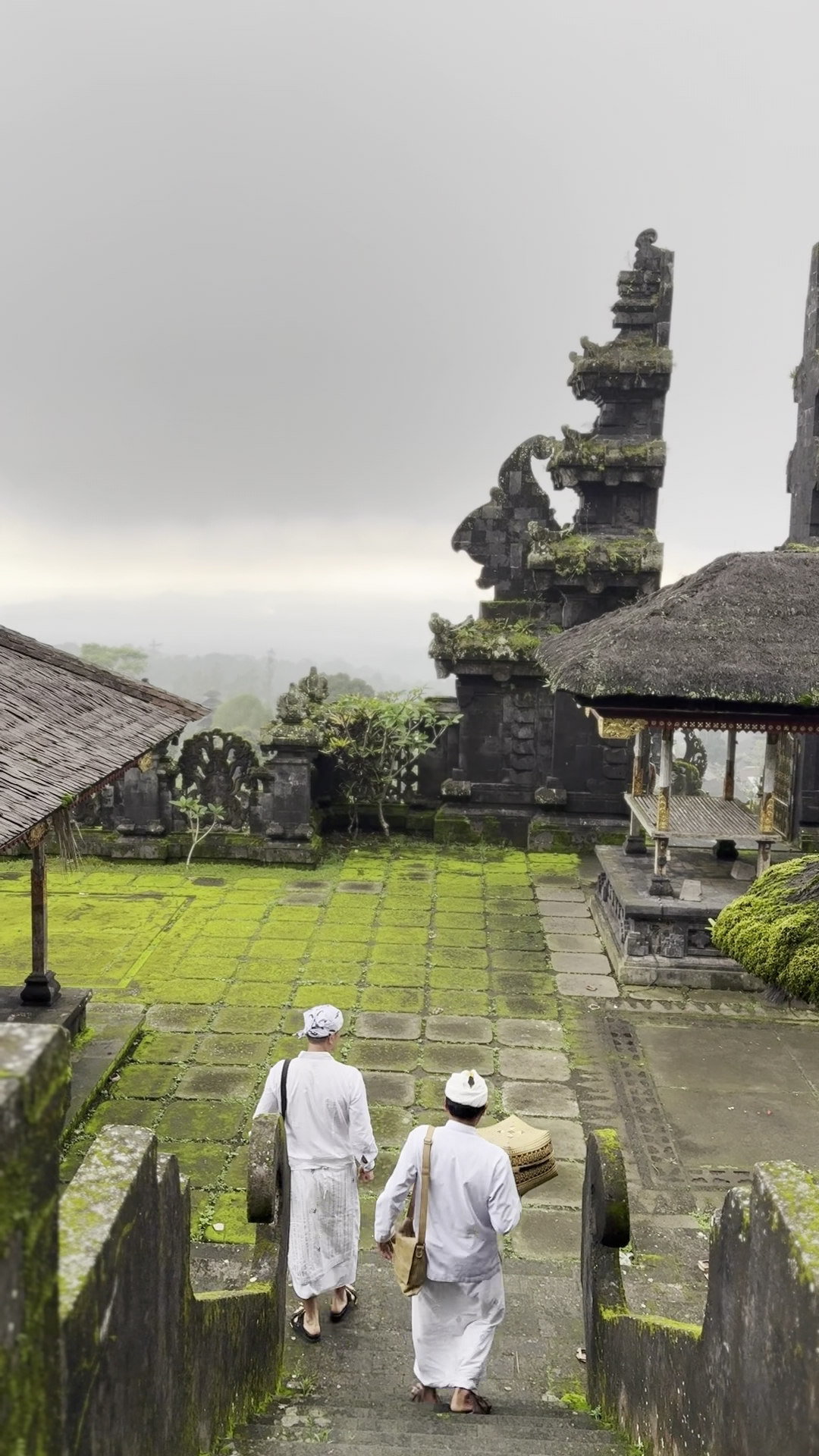 The moment I arrived, I was swept into a sea of white. Devotees, dressed in pristine shirts and sarongs, their heads wrapped in traditional udeng headbands, filled the courtyard in a quiet, rhythmic hum of prayer. Umbrellas—some bright pink, others checkered blue—bobbed above the crowd, shielding them from the drizzle as they sat cross-legged, sharing offerings of rice and flowers. The scene was alive, almost electric, with the murmur of mantras and the soft clink of bells, yet there was a profound peace beneath it all. It was as if the mountain itself was holding its breath, watching over this sacred gathering.