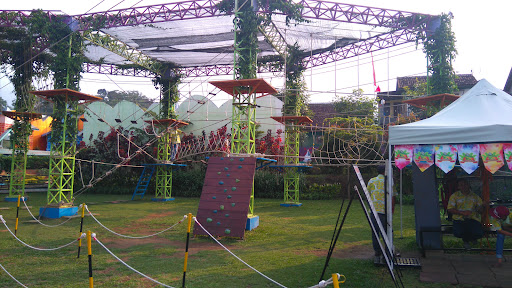 Wahana permainan yang tersedia berupa trampolin, playground, bom bom car, kereta, flying fox, kolam renang dan marry go. Dan semuanya gratis meski tidak memakai tiket terusan (hanya Rp 50.000,-). Musholanya bersih dengan tempat wudhu terpisah.