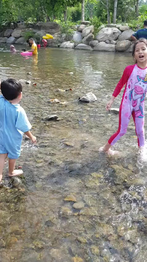 Sungainya sudah dipasang batu untuk membuat kolam kecil sehingga aman buat anak anak. Disarankan anak anak tetap memakai celana dan celana dalam, menjaga jaga seandainya ada lintah.