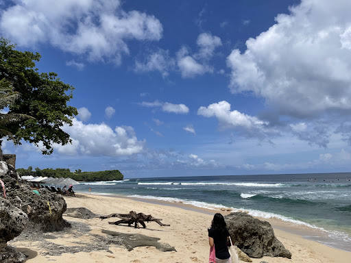 Read moreWe visited Balangan Beach during the late morning/early afternoon when the tide was quite low. We were greeted with a scenic view, giving us fantastic photo opportunities. The water was very clear, making it appear quite blue in the deeper parts. However, the sand was quite coarse and stepping in it made our feet sink, making it rather difficult to walk. Since the tide was out, a large stretch of the beach was just a rocky floor, making the (barefoot) walk out into the water painful. Aside from that, the rest of the time we spent there was enjoyable. There were a number of surfers out catching some waves, which looked perfect for surfing. We had food and drinks at a little café overlooking the beach, which was reasonably priced and quite tasty. We left in the middle of the afternoon, but the sun was on track to set right on the horizon, which I assume would have made a...