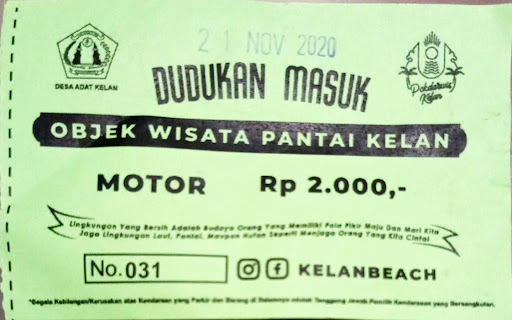 Untuk masuk ke pantai ini, kalau naik motor, enak masuknya lewat pasar ikan Kedonganan.. Sampai di ujungnya, belok kiri, dan akan masuk ke wilayah properti Angkasa Pura.. Jalan saja terus, nanti akan ngedapetin "loket tiket parkir" semi permanen (orang yang mengutip, dengan tiket parkirnya).. Untuk motor: IDR 2,000.. Untuk mobil, saya tidak tahu, karena tidak membawa mobil. HTM ini termasuk parkir dan ke-2 wilayah pantai: Pantai Kelan, Pantai Tuban.