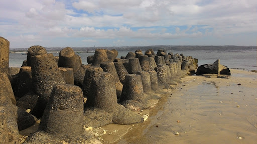 The sandy beach is beautiful, with the arrangement of concrete shore retainment that makes the photo look unique.