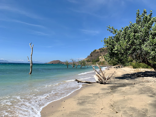 Pesisir pantai yang memiliki pasir putih di beberapa tempat ini berhadapan langsung dengan bukit-bukit tandus yang berdiri garang di depannya.