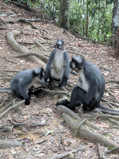 There are guides who will take IDR150,000 per person to nicely show you the trail up to see the Orangutans up in the forest and Thompson leaf monkeys.