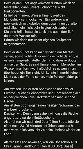 Aber eben der Fahrer nahm uns dann mit und brachte uns zum Bootsanleger, wo wir ausgestattet werden sollten für die Schnorcheltour. Dort haben wir dann zum ersten Mal gesehen, was das hier für ein Ausmaß annehmen soll. Es standen gut und gerne 90 Leute auf einem Fleck, die mit Flossen, Brille und Schnorchel ausgestattet werden sollten. Wir bekamen erneut Halsbänder mit Tickets dran. Insgesamt gab es drei unterschiedliche Halsbandfarben. Jede stand für ein anderes Boot. Auf jedes Boot passen bis zu 30 Leute drauf. Also waren tatsächlich bis zu 90 Touris involviert. Als wir dann endlich alles hatten, rief eine Frau (nach reichlich warten natürlich) unsere Farben auf. Sie erklärte uns schnell, dass es eben keine Garantie gibt, dass wir bestimmte Tiere sehen werden und ob wir das verstehen. Dann bot sie uns noch Tabletten gegen Seekrankheit an und sagte uns wir sollen warten. Also standen wir erneut herum. Dann durften wir irgendwann zu unserem Boot gehen (auch nochmal ca. 5-7 Minuten) Es war klein und extrem wackelig. Alle waren eng an eng, wenig Platz um Sachen anzulegen geschweige denn Rucksäcke (man hätte sie auch im unabgeschlossenen Büro lassen können, nein danke). .... Teil 2 und weitere...