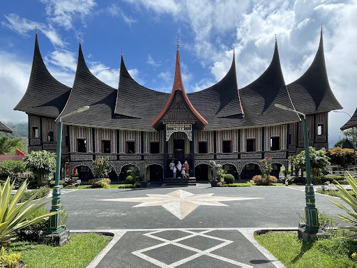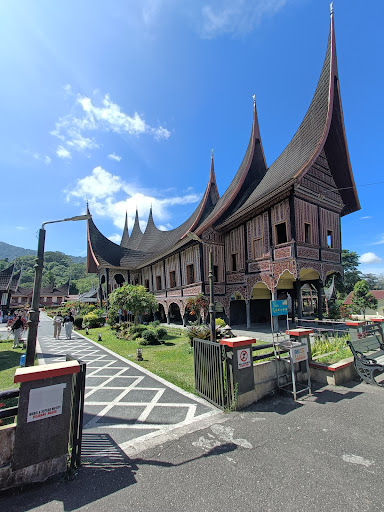 Looking at the building behind you, with its iconic pointed roof design, thatβs a Rumah Gadang β the traditional Minangkabau house. From the architecture and setting, this looks like Istano Basa Pagaruyung in Tanah Datar, West Sumatra,...