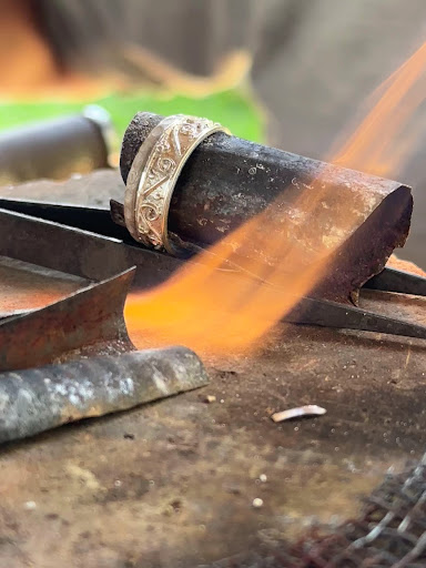 Details: 💍 This Art and Workshop centre is about a 10 minute scooter ride from central Ubud. There are parking spaces for scooters on the opposite side of the road, and my scooter was perfectly safe for the three hours I was there 💍 You enter down a tiled side path into a picturesque, traditional Balinese homestead. There was a wood-carving workshop taking place in one area, with lots of people attending, and there were two tables set up for silver making. 💍 It was just me and one other solo traveller making our rings, so it felt like a private lesson! 💍 They provided cold water and two small cakes when I got there 💍 There were fans to keep cool, and the area you're working in is shaded so you can stay safe from the sun 💍 There are so many designs to choose from, touch, explore, and once you've found one you dive straight into adding a stamped message. TIP- make sure you get the letters the correct way round, especially the S which has a small curve and a big curve! Test it out first! 💍 I coiled metal, soldered things myself, placed on decoration, stamped the message, filed down and buffed/polished my ring myself. Lots of other workshops seem to do a lot of the work for you, but the teachers were so wonderful and supportive that they really let you do as much as you like here! 💍 When finished, they provided me with a certificate (so cute!) and a little ring box made of woven leaves to keep it safe. 💍 Toilets available