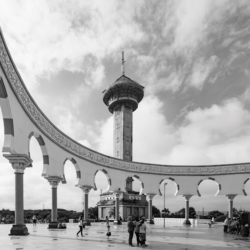 Read moreThe mosque complex covers 10 hectares There are three central buildings arranged in the shape of a U, with the domed mosque at the centre; all buildings have pitched, tiled roofs, while the central mosque has four minarets. The central roof resembles the roof of a "joglo", the traditional Javanese house, and symbolises the rising steps toward heaven or to gain God's blessing. The long buildings forming the arms of the U house a library and auditorium respectively. At the open end of the U is a series of Arabic-style arches, with Arabic calligraphs of 99 attributes of Allah, stood on 25 pillars, each representing one of the named prophets in Islam.