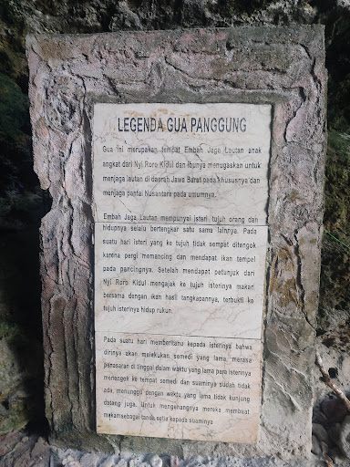 Menurut cerita yang berdiam di gua ini adalah Embah Jaga Lautan atau disebut pula Kyai Pancing Benar. Beliau merupakan anak angkat dari Dewi Loro Kidul dan ibunya menugaskan untuk menjaga lautan di daerah Jawa Barat pada khususnya dan menjaga pantai Indonesia pada umumnya oleh karena itu beliau disebut Embah Jaga Lautan