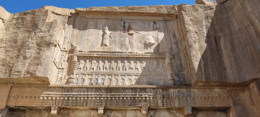 Although Naqsh-i-Rustam had long been a sacred area (as the remains of a Pre-Achaemenid relief show), Darius the Great was the first to choose it as a burial place. His successors not only imitated his idea of a cliff tomb but also copied the layout of the tomb itself. The dramatic facade of the tomb is constructed like a cross. An entrance leads into the tomb chamber, cut deep into the rock. In the panel above this facade is a relief depicting the king standing on a three-stepped pedestal in front of an altar. His hand is raised in a gesture of worship. Above him floats the winged disk of Ahuramazda, god of the Zoroastrian religion. This scene is supported by throne bearers representing the twenty-eight nations of the empire. On the side panels are the king's weapon bearers and the Persian guards. The trilingual cuneiform inscriptions on three panels of the rock wall either enumerate the twenty-eight nations upholding the throne or glorify the king and his rule. Some traces of pigment found on the facade of the royal tombs suggest that all or most of the stone reliefs had...