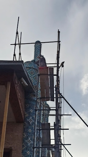 دو نیم ستون وسطی که درست در طرفین ورودی قرار گرفته بلندتر و بر بدنه هر یک ۱۲بار نام پیامبر اسلام محمد بن عبدالله به خط کوفی بنایی با طرحهای هندسی آراسته شدهاست. در حد و فاصل نیم ستونهای ورودی ۲ طاق نمای نسبتاً عمیق وجود دارد که با کاشیهای هفت رنگ نماسازی شدهاست. روی این طاق نماها نقوش اسلیمی و یک ترنج هندسی نقش شدهاست که در وسط آن نقش شیری وجود دارد که گاوی را از پای درآورده است. در تمام نقوش مذکور که بر کاشیهای هفت رنگ نقش شده و نیز نقوش بخشهای دیگر، غلبه با رنگ زرد است. در دو سوی ورودی این بنا در همین ضلع نقش ۲ سرباز مسلح قاجار دیده میشود که بهطور نمادین همچون ۲ نگهبان همیشه بیدار با چشمانی گشاده پیوسته ورودی و خروجی این ساختمان را...