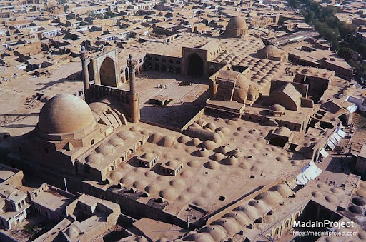 Linking the four iwans at the center is a large courtyard open to the air, which provides a tranquil space from the hustle and bustle of the city. Brick piers and columns support the roofing system and allow prayer halls to extend away from this central courtyard on each side. The roof of the mosque is a panoply of unusual but charming domes crowning its...
